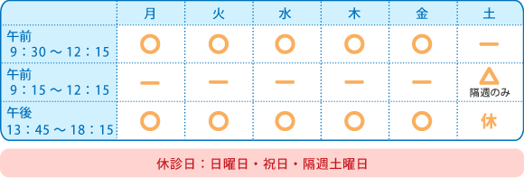 ○平 日:9:30~12:15(11:30まで受付)/13:45~18:15(17:30まで受付)